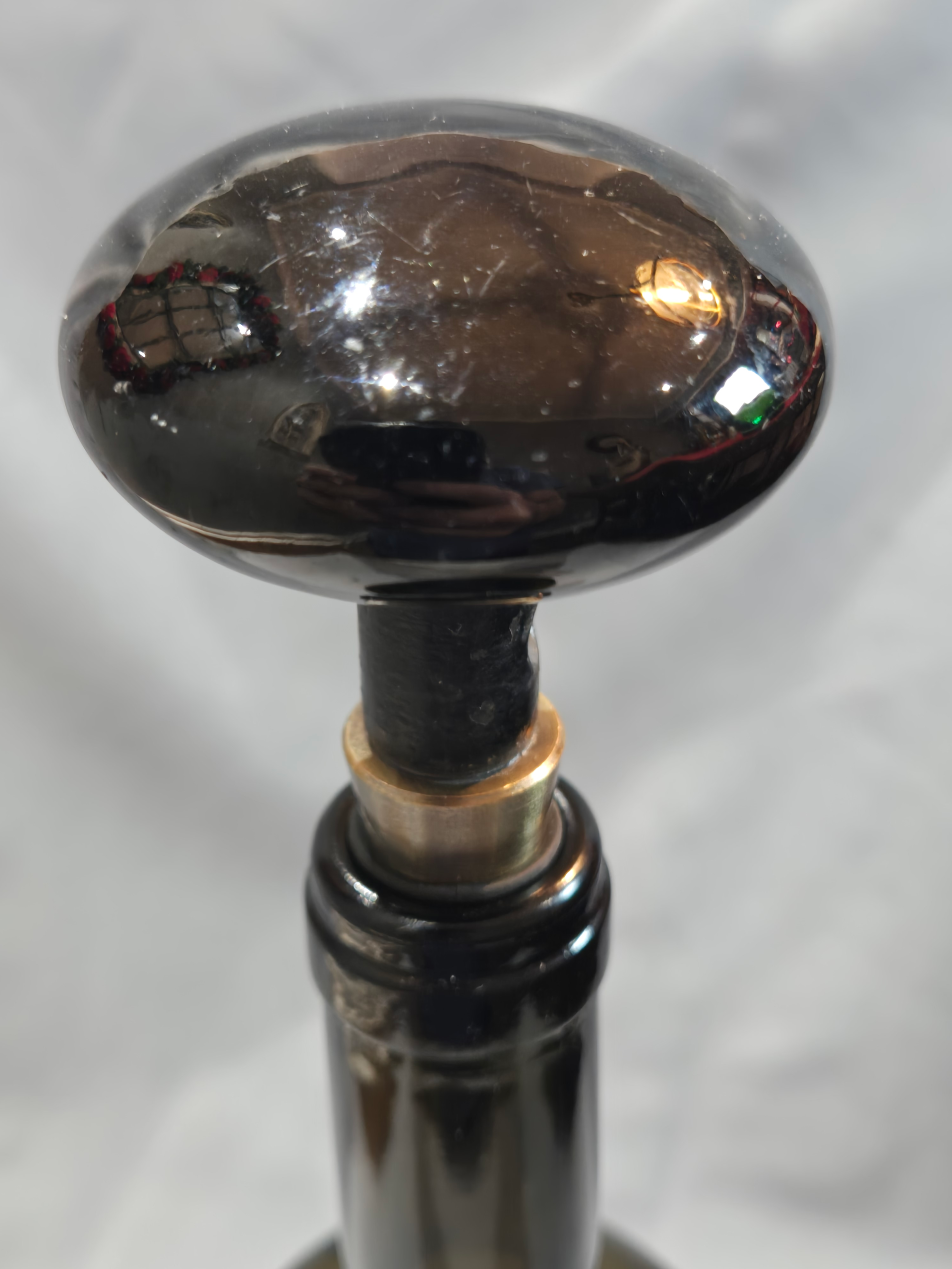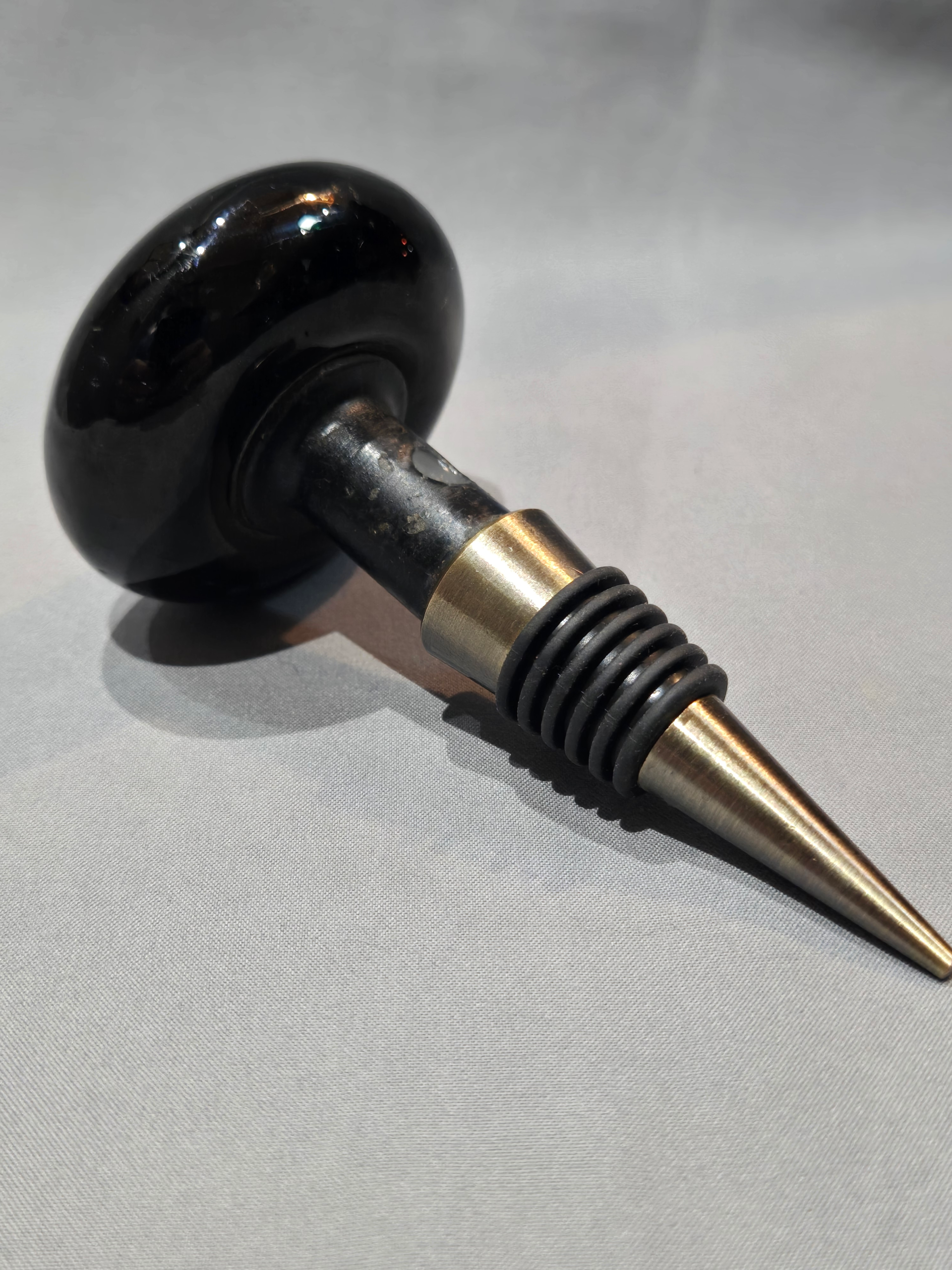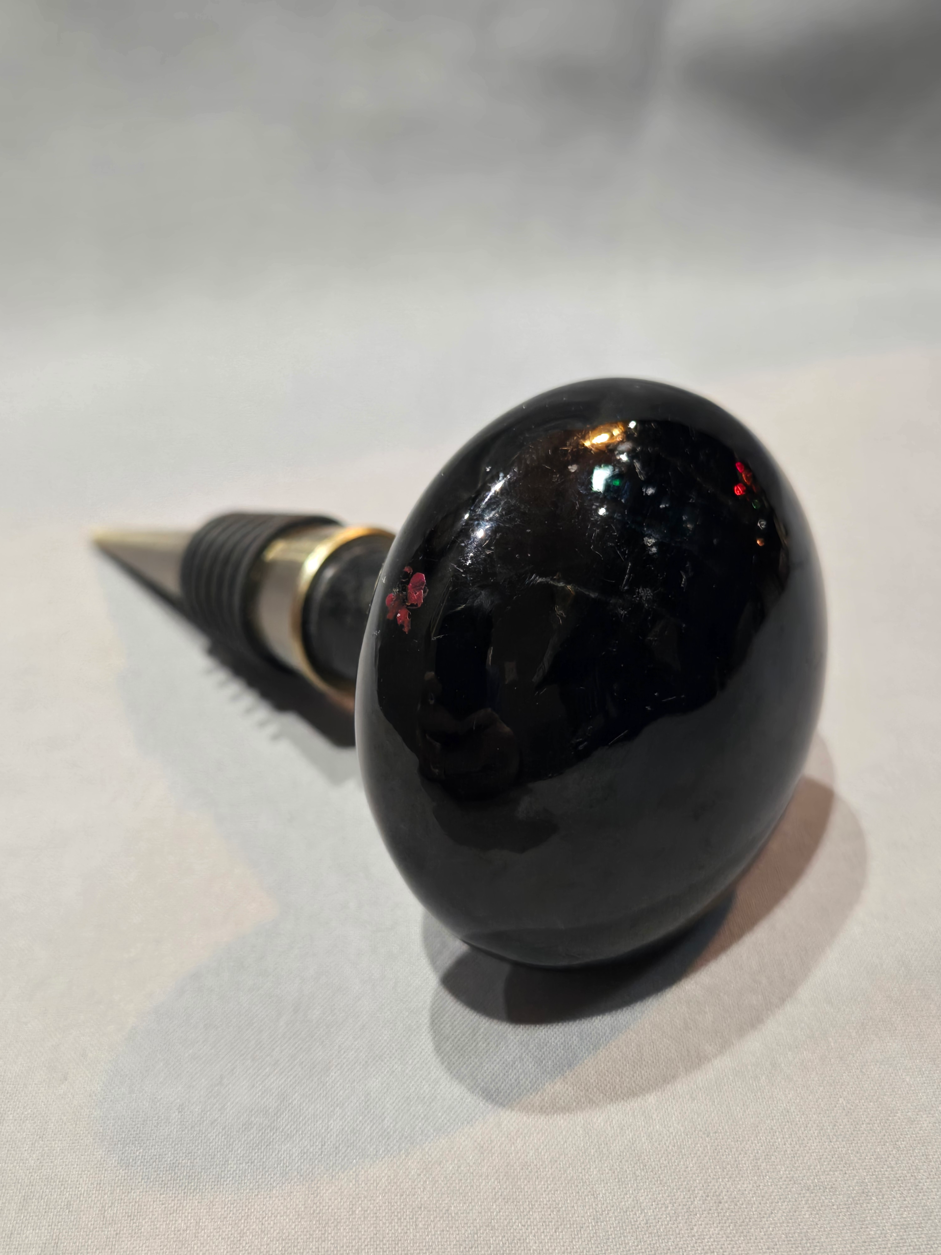 This common-place onyx door knob was used in many applications, including common work places, such as a schoolhouse. These enameled knobs were made to last and many are still in use today. They became popular around the 1920s. This model is atop a matching wine stopper and is ready to become a conversation piece for your guests.