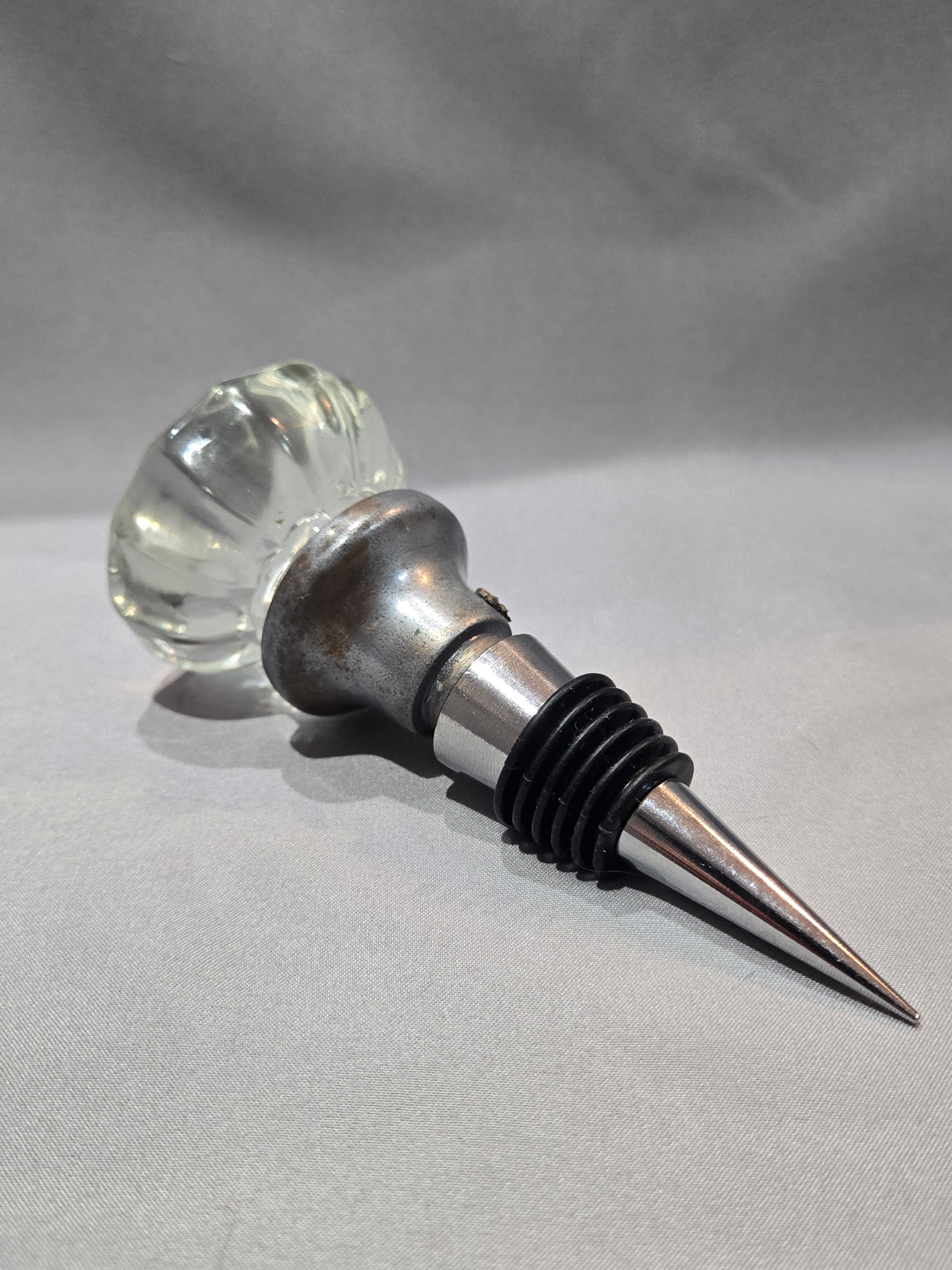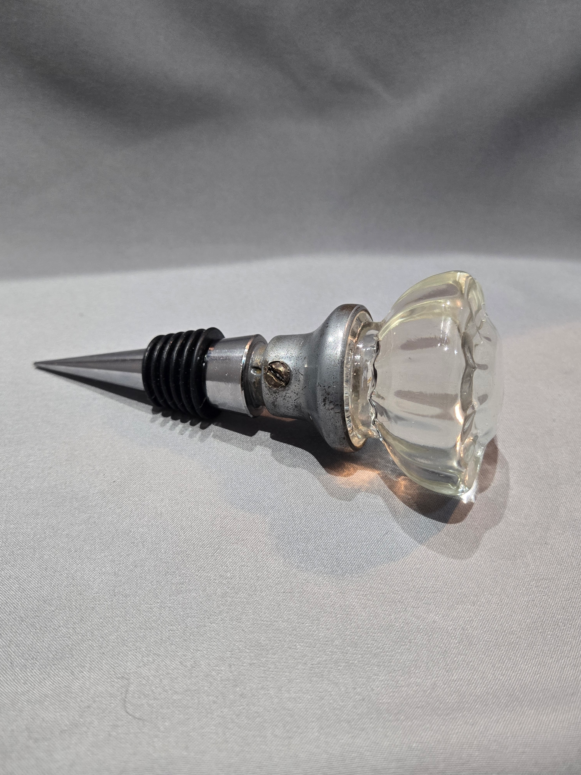 This classic fluted glass door knob was very common in the 1930s and we have affixed it to a matching wine stopper to give it appeal. This stopper will fit most common wine bottles, as you can see here.