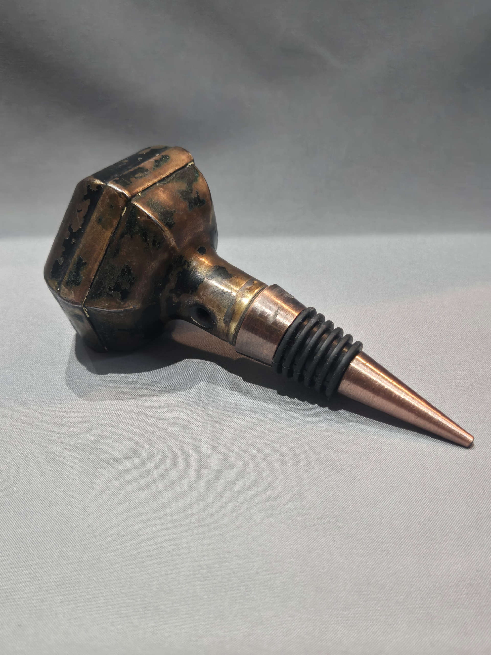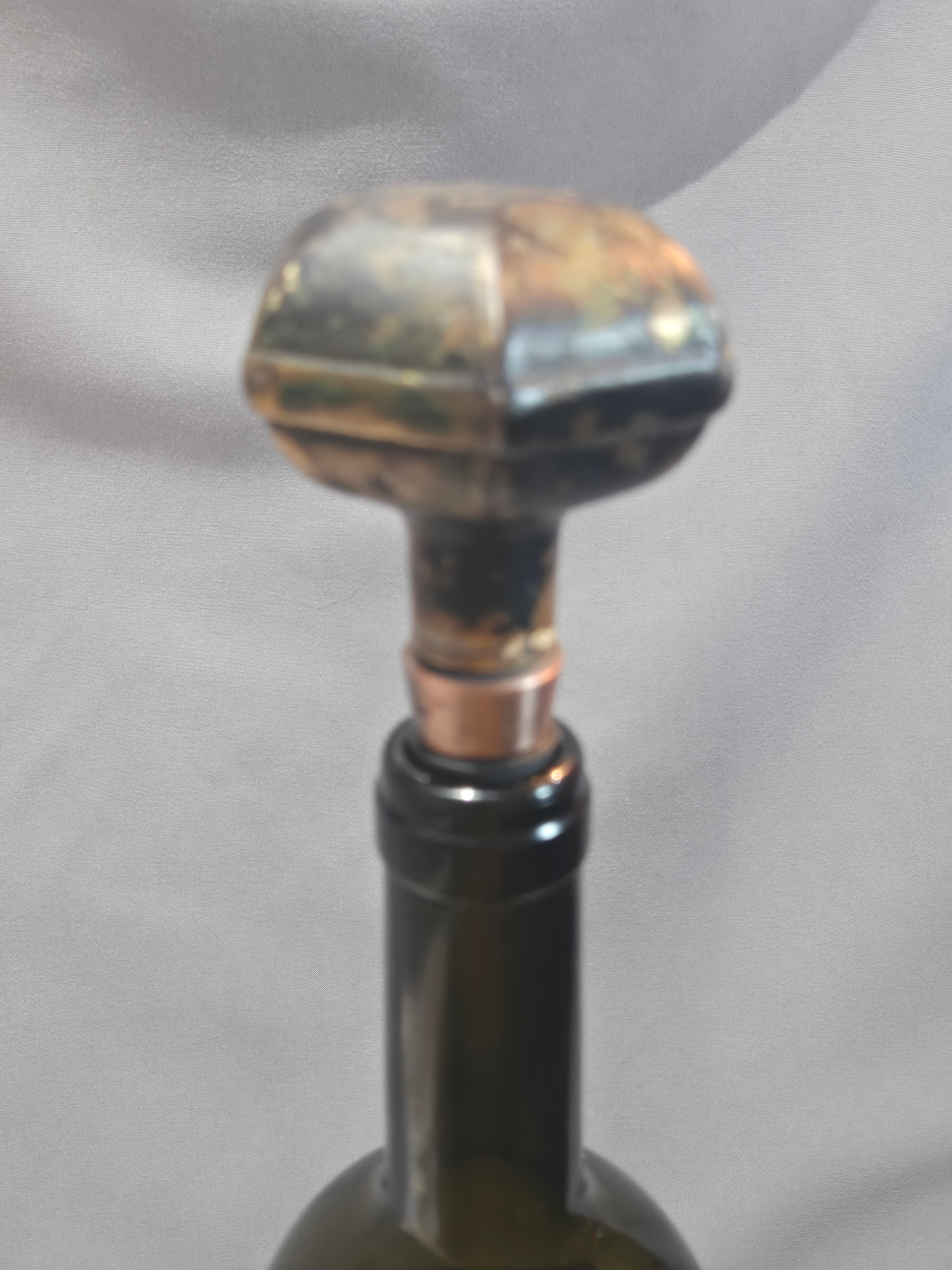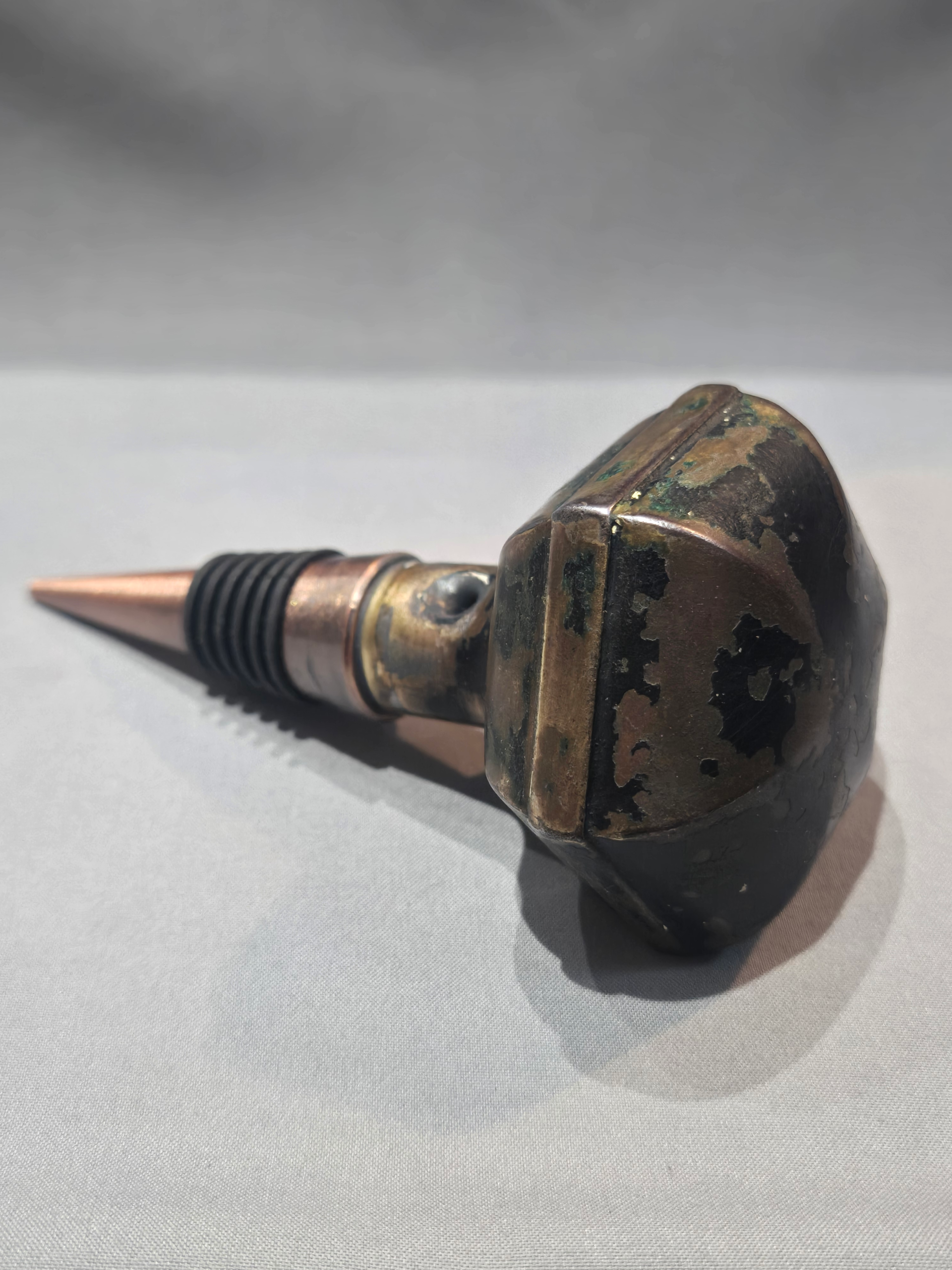 This Penn Hardware door knob was first listed in a catalog in 1915 and was made in a light copper. It is shown here with a matching copper style wine stopper and will fit atop any common wine bottle.